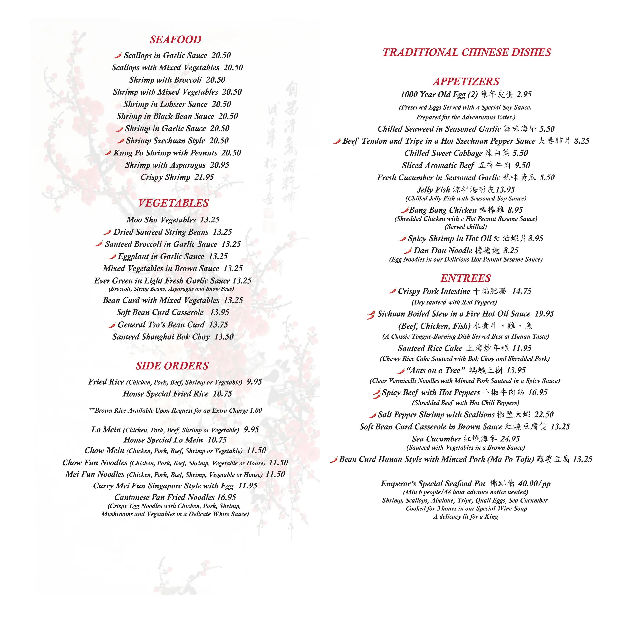 Menu items and prices are subject to change. The experienced chefs of Hunan House Chinese Restaurant create authentic Chinese dishes using fresh ingredients and traditional recipes. House Special Mei Fun Thin Rice Noodle Combination of Shrimp Chicken Pork and Vegetable 1595.